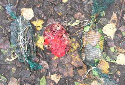 Ora ci dividiamo in tre gruppi, ognuno dei quali avrà il compito di riempire una retina verde con elementi naturali reperiti nel bosco.