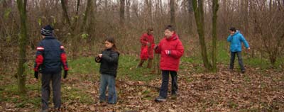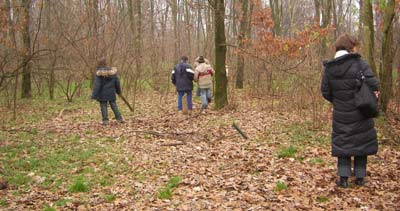 Camminiamo verso il bosco, ci inoltriamo tra gli alberi: non fa freddo, ma la giornata è grigia.