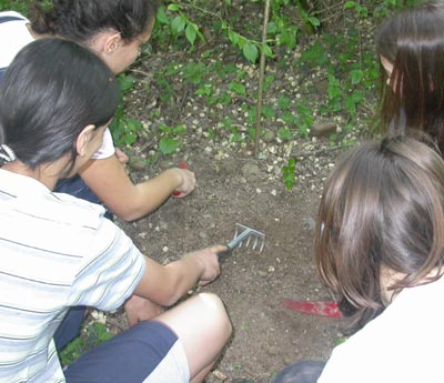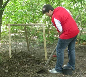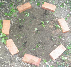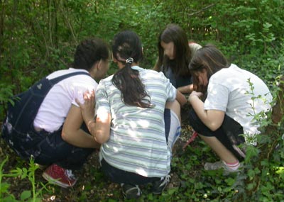 Vi dividete in quattro gruppi ed entriamo nel bosco: individuate le zone di lavoro, ciascun gruppo comincia a pulirle. per poi delimitarle con dei mattoni.