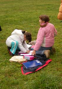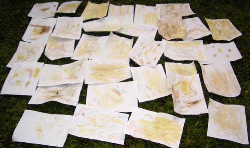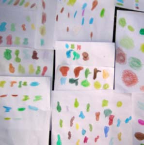 Ci sistemiamo ora tutti in fila, davanti a un tratto di bosco e proviamo quindi a "catturare" tutti i colori che abbiamo davanti e a riportarli sul foglio sotto forma di macchie di colore.