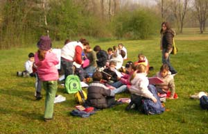 Dopo aver fatto un percorso all'interno del boschetto - tra casette per uccelli, aree per gnomi, labirinti, spazi con oggetti "suonanti",... ci avviamo allegramente verso il pulmann e poi ... tutti a scuola.