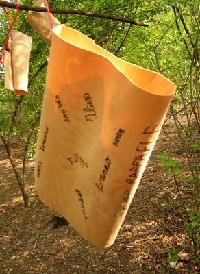 Vi mettete in fila e, uno ad uno, firmate una bella "sottiletta" di legno che poi appenderò nel bosco. Grazie della visita, 2 B!