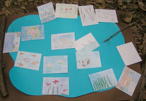 Ora osserviamo insieme il cartellone che la classe ha realizzato a scuola: si tratta del disegno di un laghetto vuoto - blu contornato dal marrone. Posizioniamo quindi una serie di piccoli disegni di animali e piante realizzati dai bambini...