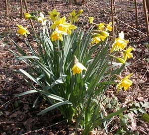 Ci spostiamo, osservando alberelli piantumati in precedenza e molti fiori primaverili, tra cui violette e, in mezzo alle foglie secche, un ciuffo di narcisi.