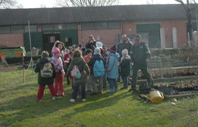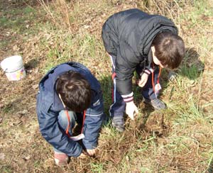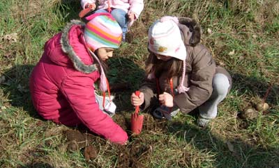 Dopo aver spiegato le semplici, ma fondamentali, operazioni da farsi per piantare correttamente una piccola piantina, segno con un piccone i punti dove i bambini faranno le buche per mettere a dimora gli alberelli...