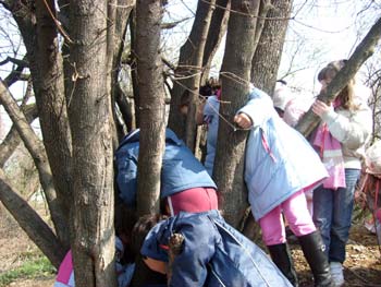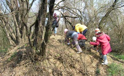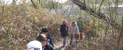In corrispondenza della montagnetta di terra più grande chiedo ai bambini di andare alla ricerca di semi - sia guardando in terra, che sugli alberi.