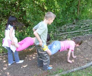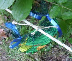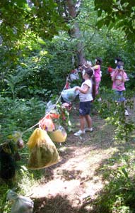Ora ci mettiamo in fila per uno, consegno ad ognuno di voi una maschera "cieca" e via, lungo il percorso con la corda e gli oggetti appesi da riconoscere.