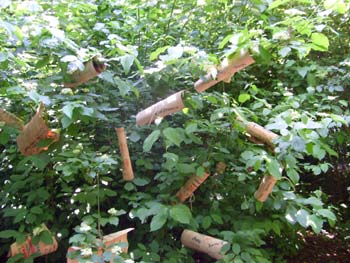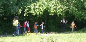 Ora, prima di tornare a scuola, lasciamo un altro segno della nostra presenza. Firmiamo tutti un foglio di legno un po' speciale, e lo andiamo ad attaccare presso un cespuglio di nome sanguinello ...