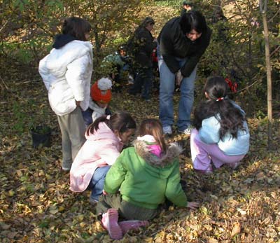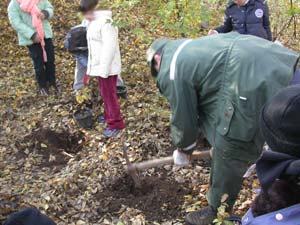 Il lavoro non è finito! Dobbiamo piantumare le pervinche! Per ognuno di voi ce n'è una, da collocare tra le querce, facendo attenzione a non calpestarle! Sono erbacee del sottobosco e stanno bene all'ombra.