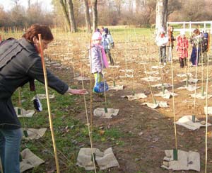 Per prima cosa segno con un piccone i punti dove i bambini dovranno fare le buche per mettere a dimora gli alberelli...