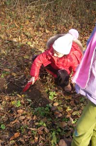 Adesso è il momento della piantumazione delle pervinche. Questa è una piccola piantina da sottobosco, che cresce bene all'ombra degli altri alberi. Noi vorremmo fare in modo che la pervinca crescesse nel modo migliore possibile all'interno di questa grande siepe per le farfalle.