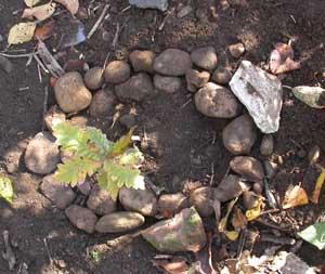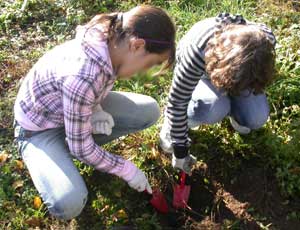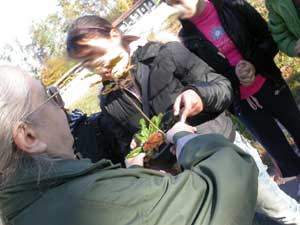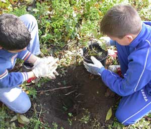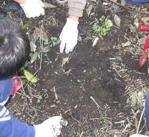 Una volta trovato, divisi questa volta in gruppi, lavoriamo in modo analogo, ma scavando buche piccole per collocarvi le piantine, distanziate una spanna una dall'atra.