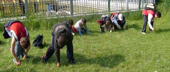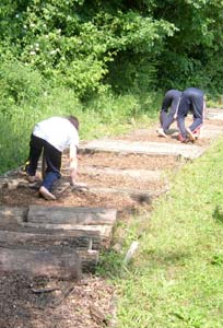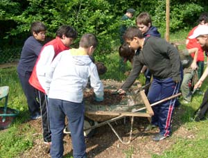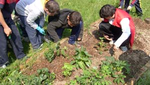 A piccoli gruppi piantiamo le piantine nell'aiuola che già contiene altre piantine piantate lo scorso anno. Mentre qualcuno prepara una terra un po' particolare, che useremo soprattutto come "pacciamatura", ovvero in copertura per far si che l'umidità del terreno non si perda.