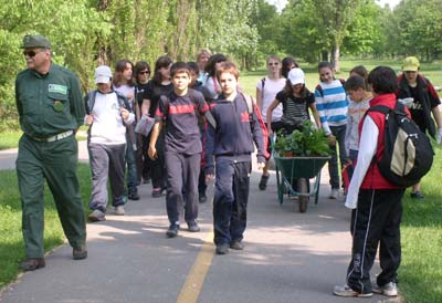 Riprendiamo il cammino, con carriola, palette e piantine, che dovremo piantare in un'aiuola presente nella zona verde all'interno della recinzione delle scuole del Parco Nord.