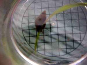 Dall'acqua dello stagno, Alessandra preleva una chiocciolina d'acqua,